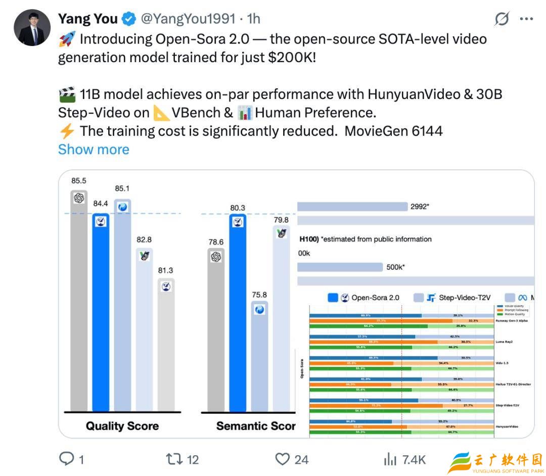 这款新开源的SOTA(State-Of-The-Art)视频生成模型,以令人瞩目的性价比吸引了业界的广泛关注。据透露,潞晨科技仅花费了20万美元(折合人民币约144.9万元),利用224张GPU成功训练出了商业级别的11B参数视频生成大模型。其性能卓越,直逼腾讯的混元和拥有30B参数的Step-Video。