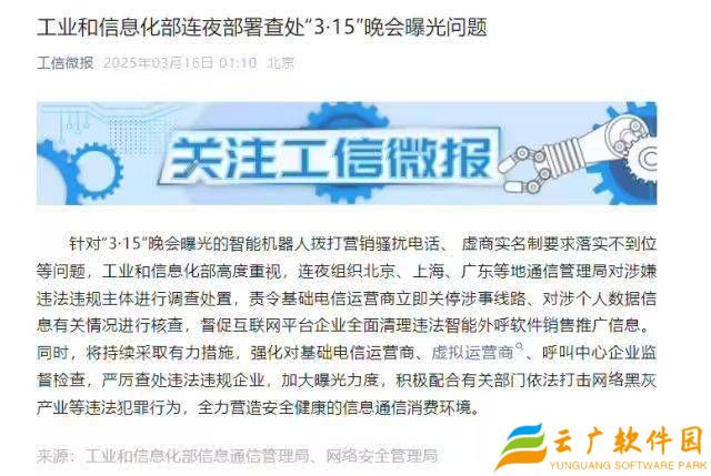 在“3・15”晚会揭露了智能机器人拨打营销骚扰电话及虚拟运营商实名制执行不力等问题后,工业和信息化部迅速作出反应,于3月16日紧急部署行动。该部门指令北京、上海、广东等地的通信管理局,立即对涉嫌违规的企业展开深入调查,并采取相应措施。