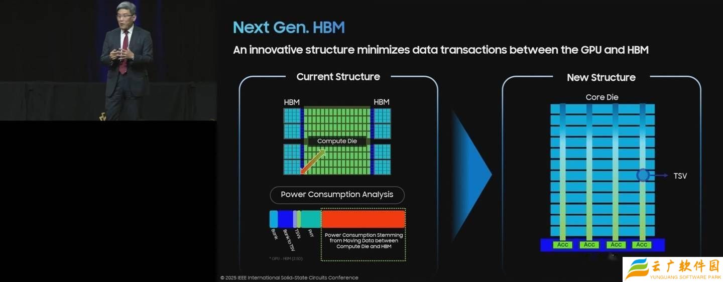 在最新的技术前沿探索中,三星电子的代表Song Jai-hyuk于IEEE ISSCC 2025全体会议上,对HBM内存的未来发展趋势进行了深入剖析。他提出了两项创新思路:一是通过定制版本减少I/O面积占用,二是在基础芯片中直接整合加速器单元。