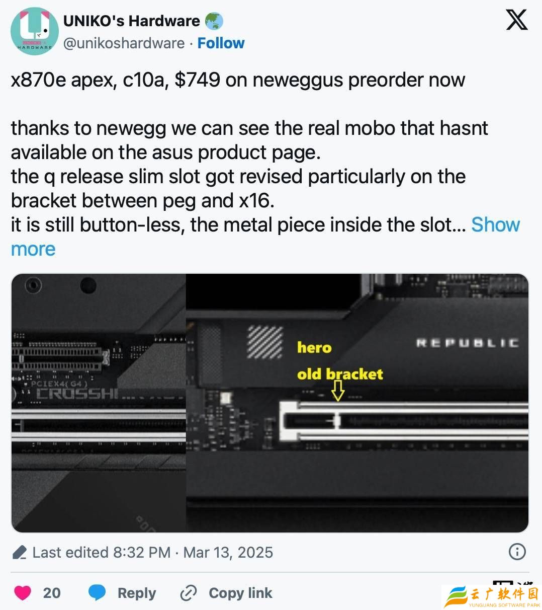 针对这一设计缺陷,华硕在新款ROG Crosshair X870E Apex主板上进行了针对性的改进。据爆料,主要的改动集中在主板的PCIe固定架上,华硕去除了原本位于电源插槽与数据插槽之间的金属部件,从而优化了显卡安装与拆卸的过程,降低了金手指受损的概率。