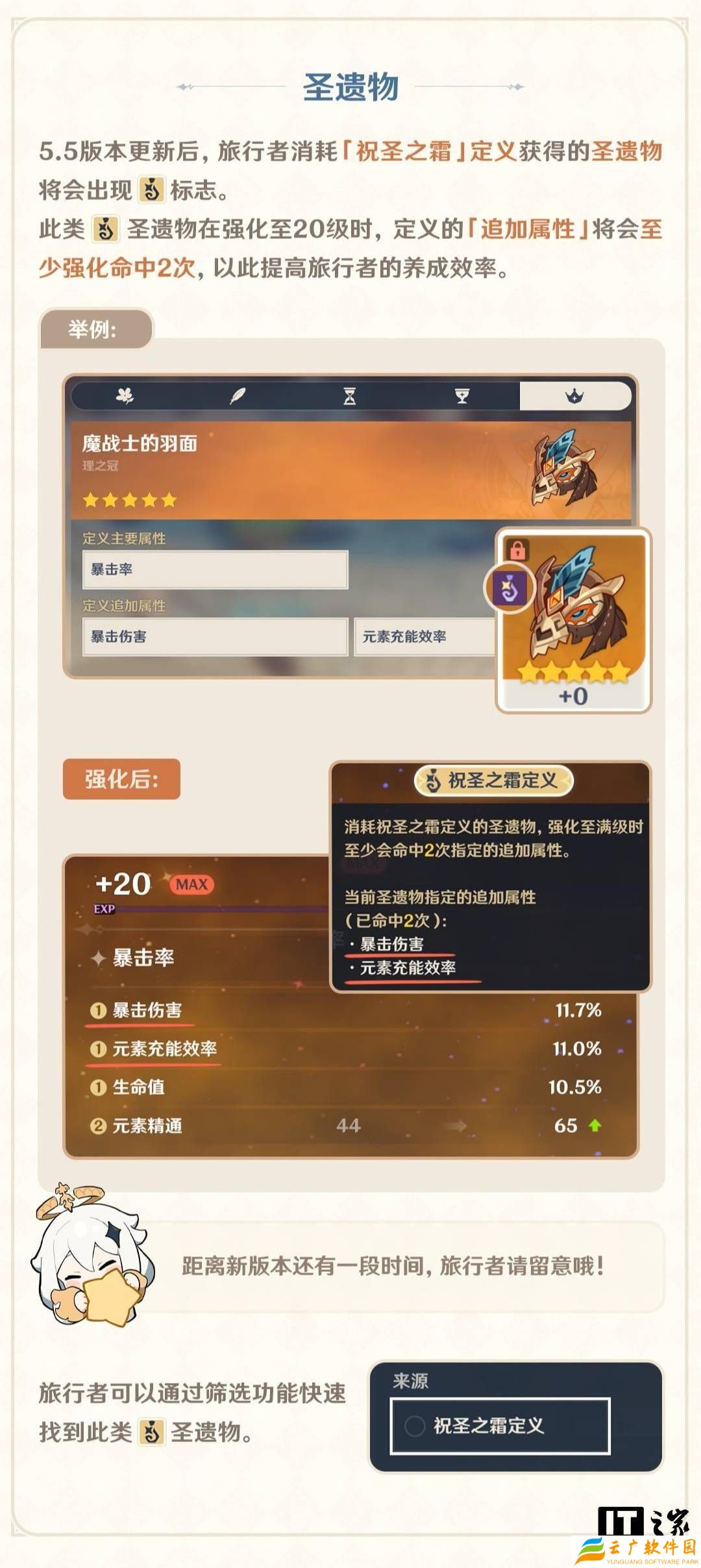 在圣遗物方面,5.5版本将引入一个名为「祝圣之霜」的新机制。玩家使用该机制定义的圣遗物,在强化至满级时,其追加属性将至少获得两次强化,从而极大地提升了角色培养的效率。为了方便玩家识别这类圣遗物,系统还将提供筛选功能。