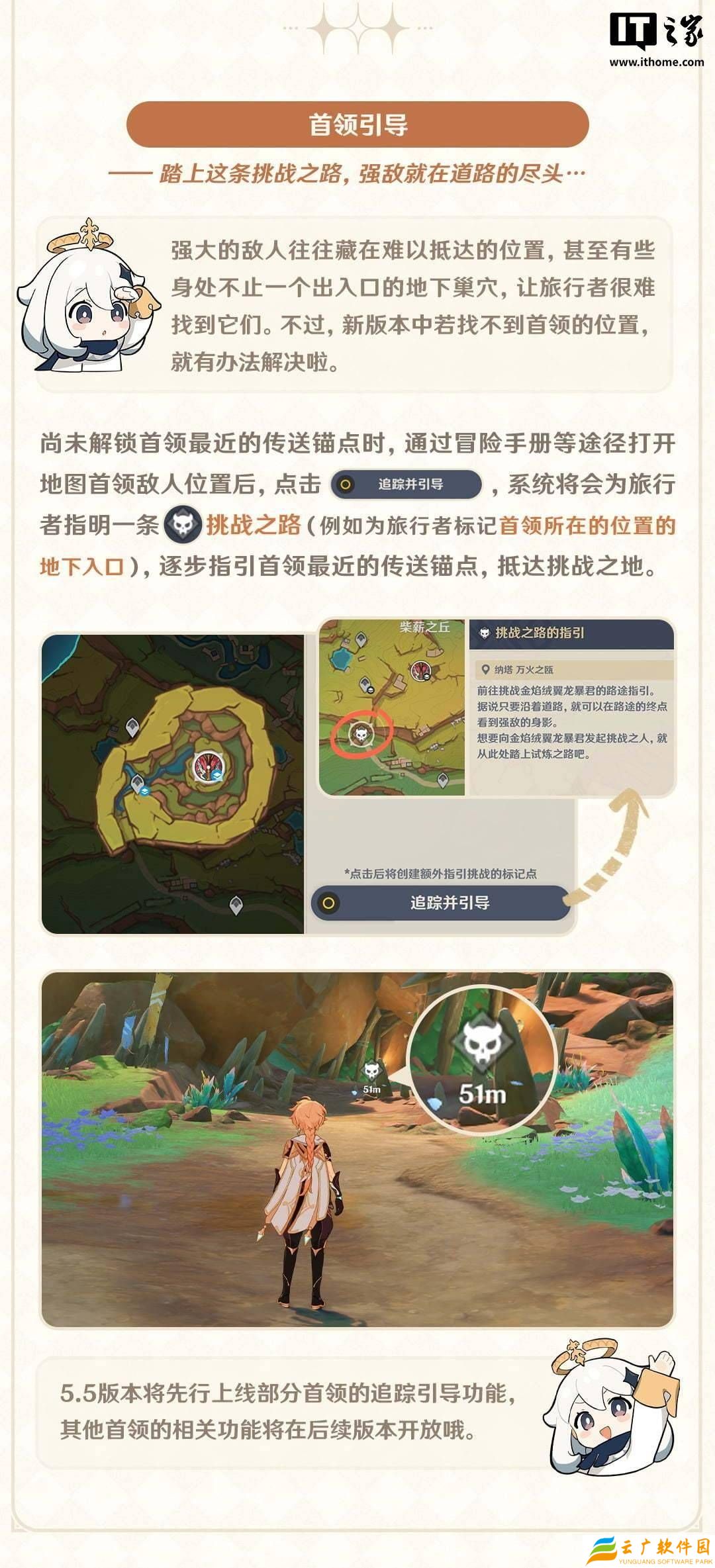 针对首领敌人的挑战,新版本也提供了更加人性化的引导功能。当玩家尚未解锁首领附近的传送锚点时,可以通过冒险手册等地图功能找到首领的位置,并点击“追踪并引导”。系统将自动为玩家规划一条前往首领所在地的路线,包括可能的地下入口等,逐步引导玩家到达挑战地点。不过,这一功能将首先在部分首领中开放,其他首领的引导功能将在后续版本中逐步推出。