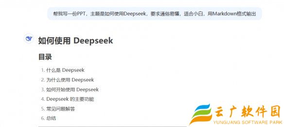 3、之后给出指令,如“帮我写一份PPT,主题是如何使用Deepseek,要求通俗易懂,适合小白,用Markdown格式输出”。