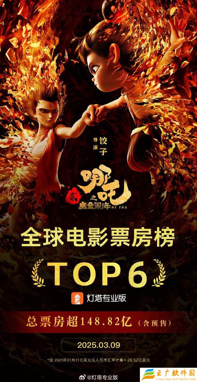 近期,全球电影市场传来震撼消息,国产动画电影《哪吒之魔童闹海》在票房上取得了重大突破。根据灯塔专业版全球票房榜的最新数据,截至某一时刻,该影片的全球票房(包括预售在内)已成功跨越148.82亿大关,这一成绩不仅令人瞩目,更将其推上了全球影史票房榜的前六强宝座。