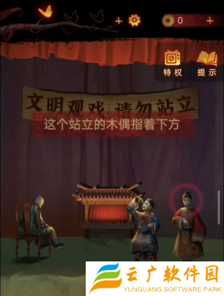 8、使用望远镜在观察戏台上,把葫芦放到中间小人位置,掉落木剑道具,然后把木剑在放到男童手中,获得蝴蝶板凳,把板凳放到戏台右边小人上,使用望远镜查看戏台处获得酒壶;