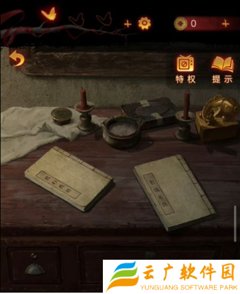 3、把木偶头放到神龛,近距离观察报纸,选择书本下的抽屉解开铁钩,转到颜料桌获得画笔;