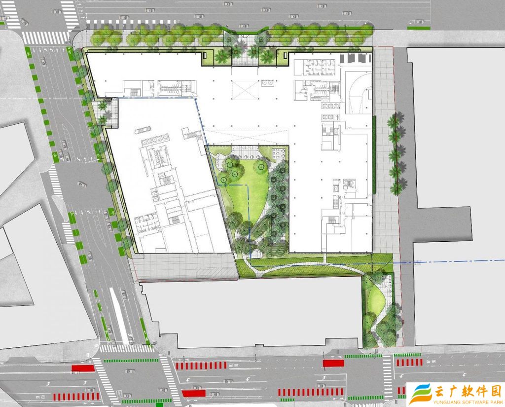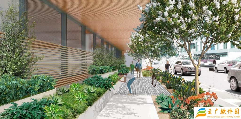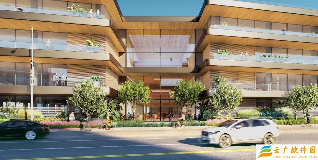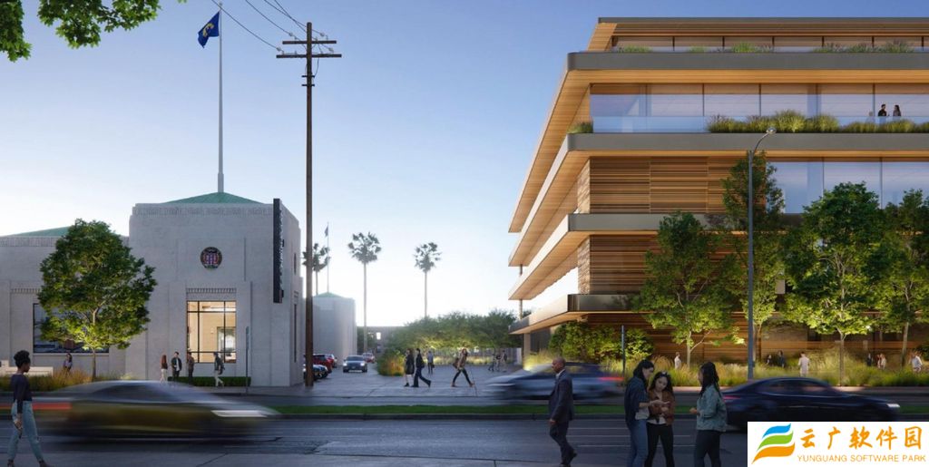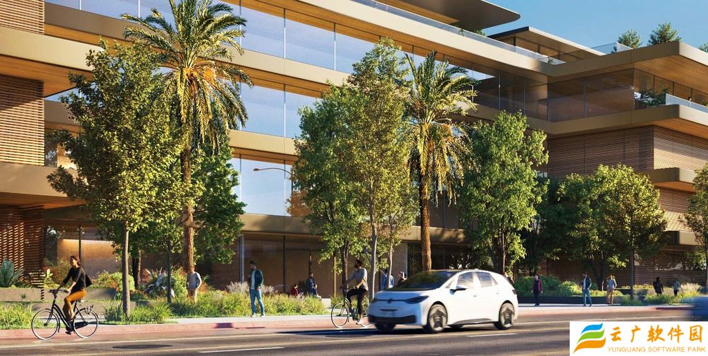 该建筑拥有 5.8 万平方英尺开放空间,包括中央庭院、威尼斯大道与 National 大道两侧的景观步道。面向 Washington 大道的后方将打造小型公园式景观区,毗邻苹果现有办公点(8777 Washington Boulevard)。