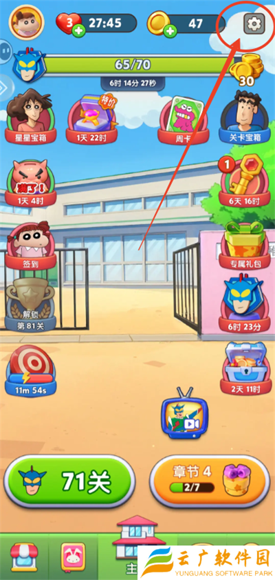 2.闯关至【11关】,解锁主页所有功能之后,点击主页【设置】按钮,下图所示;