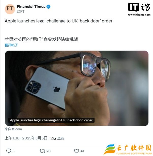 本站 3 月 5 日消息,《金融时报》今日报道称,苹果公司已向英国调查权力法庭提交法律申诉,试图推翻英国**对加密数据后门访问的要求。