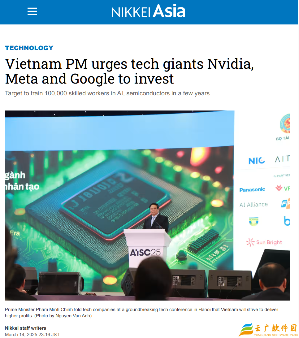 本站 3 月 16 日消息,据日经亚洲报道,越南总理范明政周五呼吁英伟达、Meta 和谷歌等全球科技巨头加大对越南的投资,并参与政策制定,以助力该国在全球技术供应链中占据更重要的位置。