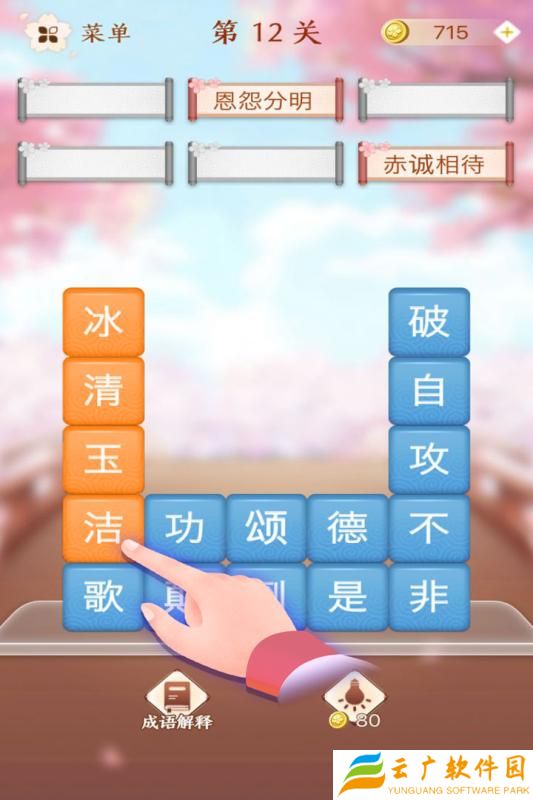 你需要把两个汉字拼在一起,形成一个方块,然后通过点击来消除它们。别看操作简单,实际上它对你的反应速度和成语储备都有不小的要求。玩着玩着,你会发现自己的成语水平不知不觉就上去了。游戏里还贴心地准备了各种道具,比如“提示符”能帮你快速找到成语,“时间延长器”则让你有更多时间思考。关卡设计也很用心,从简单到复杂,新手能轻松上手,老玩家也能找到挑战的乐趣。