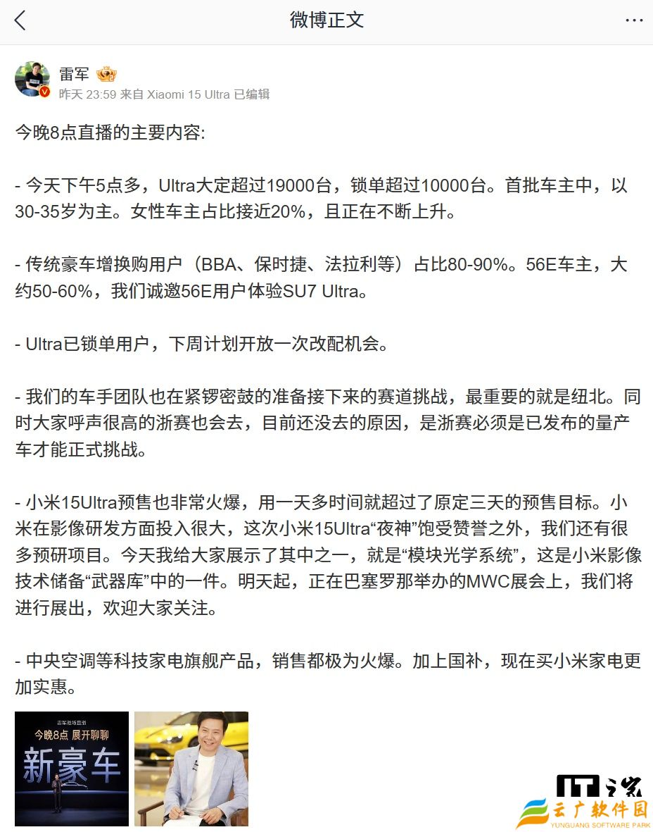本站 3 月 3 日消息,小米创办人,董事长兼 CEO 雷军昨日晚在微博发布了直播总结,谈及了小米 SU7 Ultra 汽车销售情况、新车赛道挑战情况、小米 15 Ultra 手机销售情况等。
