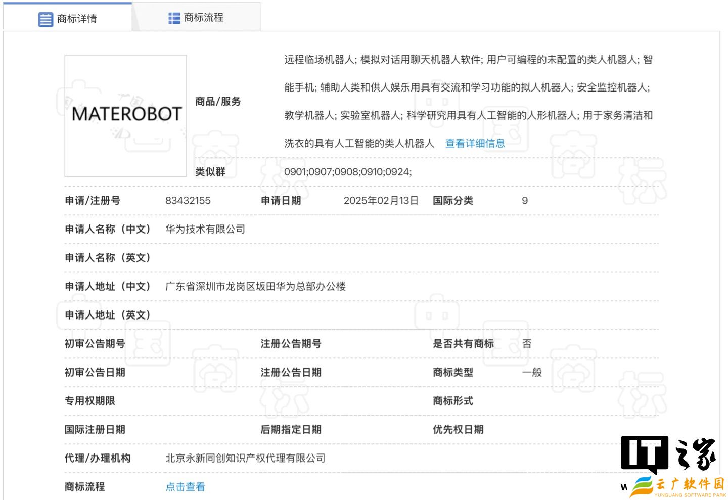 本站 3 月 16 日消息,国家知识产权局商标局(中国商标网)显示,华为技术有限公司在2月13日申请注册“MATEROBOT”商标,相应商标注册号为 83432155,国际分类为9(科学仪器)。