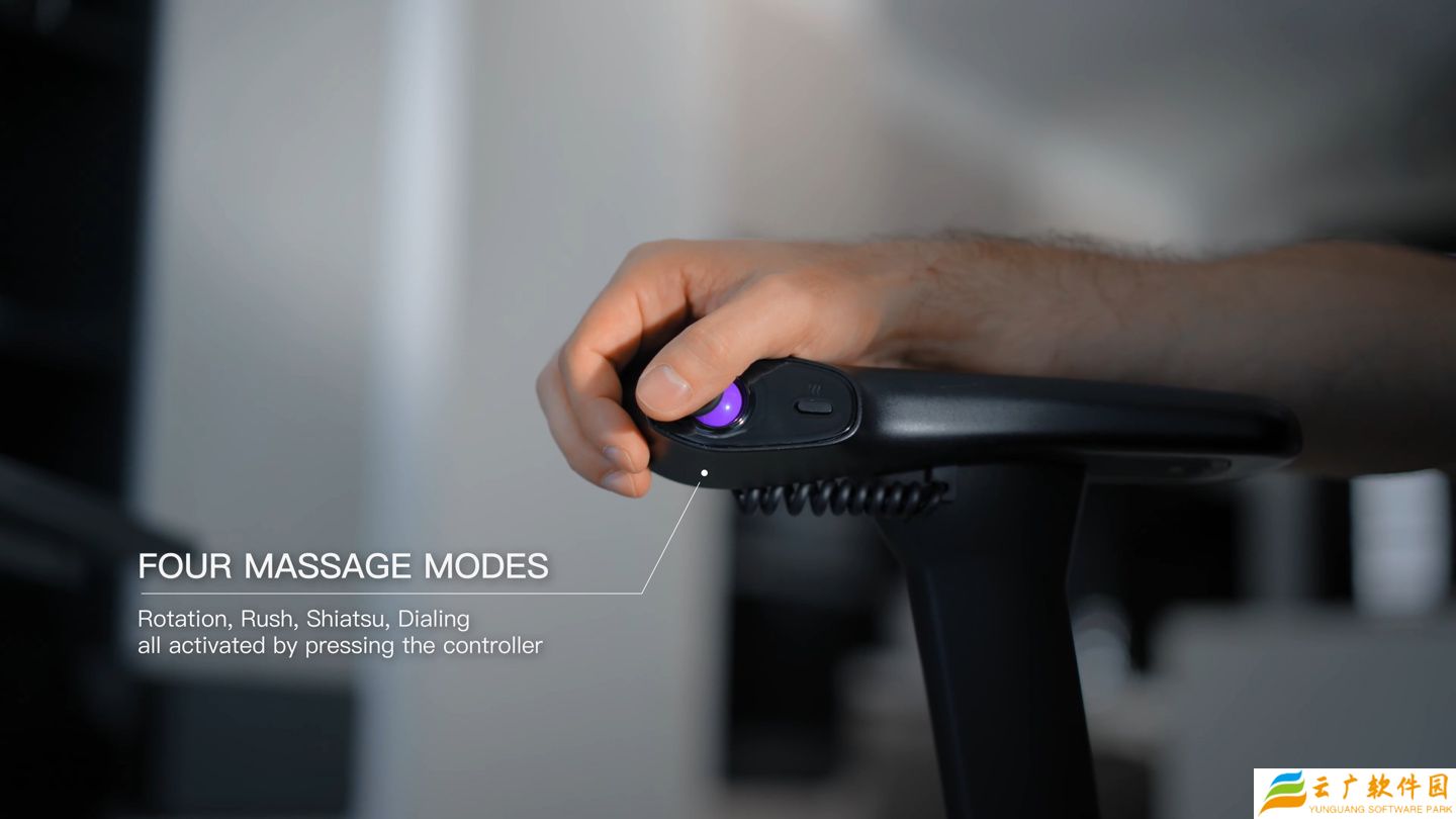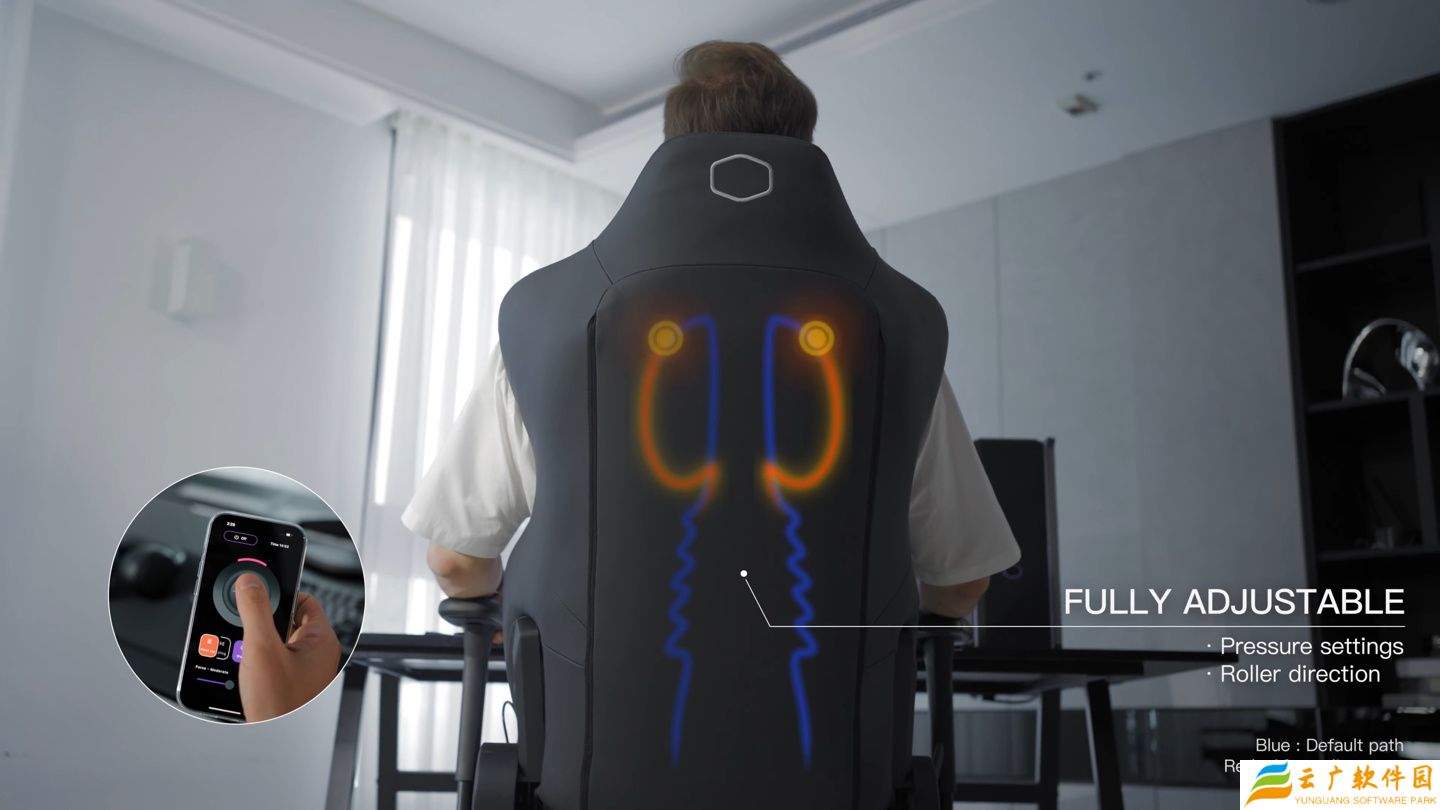 Hybrid M按摩电竞椅内置四种按摩模式,可通过位于右扶手的按键选择,用户还能通过手机应用进一步调节按摩压力和路线。