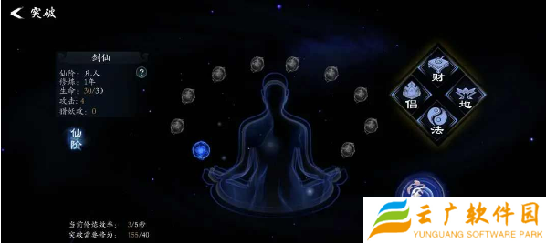在吸取完灵气后我们左上角人物头像会出现讨厌的小红点,这是说明修为可以突破到下一仙阶了,点击之后会进入下面的界面,点击突破就可以从凡人踏入修仙者的行列了。