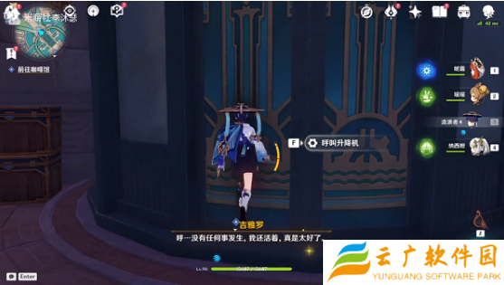 3、看完剧情之后到达一个升降机的门口,需要先完成对话,然后乘坐这个升降机到一层;