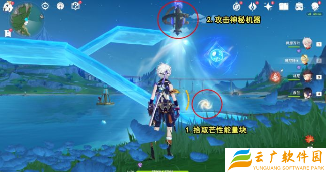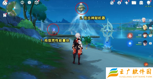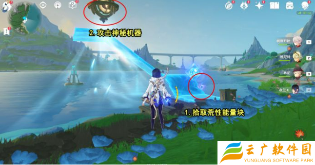 2、到达之后拾取荒性能量块攻击神秘机器并将出现的敌人消灭掉;