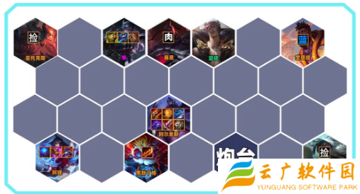 赛恩站中间最大概率直冲后排,奎桑提站在最右边开局启动能直接踢人出棋盘,剑魔站最右边第一时间送掉,为慎/赛恩提供生命值和吸血。