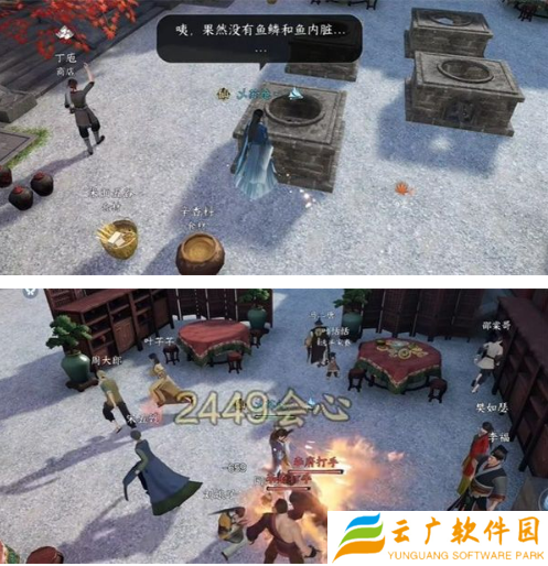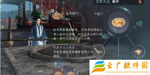 2、我们到达比赛现场认真听讲规则之后,就可以开始烹饪了【烹炒龙井虾仁】在灶台前点击右下角交互键,完成烹饪若缺少食材,可在场地内搜寻拿取,或向商人丁庖购买。