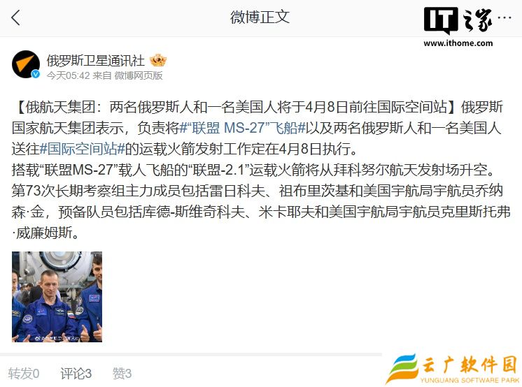 本站 3 月 5 日消息,俄罗斯国家航天集团周二宣布,“联盟 MS-27”飞船定于 4 月 8 日搭乘“联盟-2.1”运载火箭从拜科努尔航天发射场发射,届时将搭载执行第 73 次长期太空探险任务的两名俄罗斯宇航员和一名美国宇航员前往国际空间站。