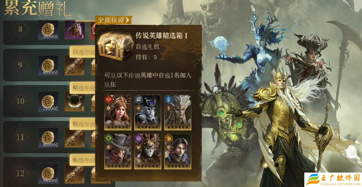 当玩家的充值额度达到五千元以上时,可以领取到累充赠礼的所有奖励,在累充赠礼当中,不仅涵盖有神器奖励,也有英雄的自选礼包可供玩家挑选。